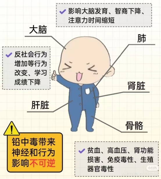 神经系统:铅中毒可以导致儿童学习困难、注意力缺陷、行为问题和智力下降。