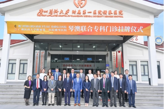 2025年7月4日,广州医科大学附属第一医院横琴医院(简称“广医一院横琴医院”)正式挂牌“澳门科技大学医学院附属医院”,双方将聚焦呼吸疾病防治、中医药、智慧医疗等前沿领域,强化医教研协同创新,积极推动粤澳两地医疗资源互联互通、医学人才双向流动、科研成果共享转化。横琴粤澳深度合作区民生事务局局长冯方丹,澳门科技大学副校长唐嘉乐、谭广亨,广州医科大学校长赵醒村、副校长李建华,广医一院横琴医院全体领导班子成员与琴澳医疗机构代表、居民共同见证了仪式。