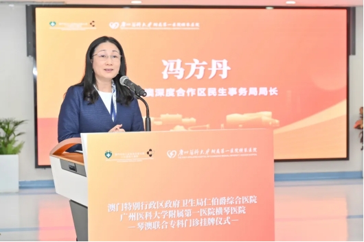 冯方丹局长表示,联合专科门诊的设立,是践行“便利澳门居民生活就业”实实在在的举措,标志着琴澳两地医疗融合发展迈入了机制化、实体化的新阶段,是琴澳两地医疗规则衔接、资源互补、服务共享的创新实践。合作区将持续优化提高医疗卫生服务水平,全力推进广州医科大学附属第一医院横琴医院建设,背靠国家区域医疗中心输出医院优质医疗资源和人才技术优势,为澳门居民提供更加优质高效、便捷实惠的医疗服务。