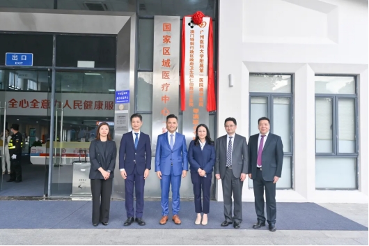 澳门特别行政区政府卫生局仁伯爵综合医院与广州医科大学附属第一医院横琴医院(下称“广医一院横琴医院”)于今(30)日在横琴粤澳深度合作区举行“琴澳联合专科门诊”挂牌仪式,标志着澳琴医疗一体化进程迈向新阶段。澳门特别行政区政府卫生局局长罗奕龙、横琴粤澳深度合作区民生事务局局长冯方丹、澳门特别行政区政府卫生局仁伯爵综合医院代院长戴华浩、横琴粤澳深度合作区民生事务局副局长苏凯慈、广医一院横琴医院院长黄锦坤、党委书记张挪富等嘉宾出席并主持了挂牌仪式。